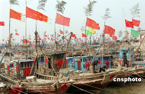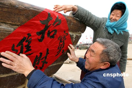 2月5日,在連云港市沿海漁村,漁民們沿襲傳統(tǒng)的漁家過(guò)年習(xí)俗。春節(jié)前,漁民在漁船上掛紅旗、貼財(cái)神、放鞭炮,插上寓意“搖錢樹”的毛竹,以祈福納祥,祈求來(lái)年新春漁業(yè)豐產(chǎn)豐收。中新社發(fā) 王健民 攝