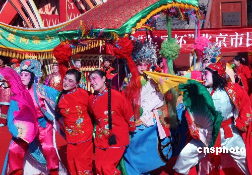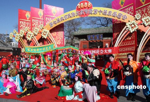 2月6日,“第七屆北京民俗文化節(jié)暨第十屆東岳廟春節(jié)文化廟會(huì)”在喜慶熱烈、歡樂祥和的氛圍中開鑼。東岳廟作為北京奧運(yùn)會(huì)主場館所在地朝陽區(qū)唯一的民俗類專題博物館,是次廟會(huì)以“祈福納祥迎奧運(yùn)”為主題,活動(dòng)內(nèi)容精彩紛呈,既有傳統(tǒng)的非物質(zhì)文化遺產(chǎn)展示,亦有新增加的民俗活動(dòng)“請福牌”、“畫福布”、“請五!、“掛盤香”等活動(dòng)。同時(shí)“東岳杯”朝陽區(qū)民間花會(huì)大賽的11個(gè)區(qū)縣、32檔花會(huì)也同臺競技。中新社發(fā) 錢興強(qiáng) 攝