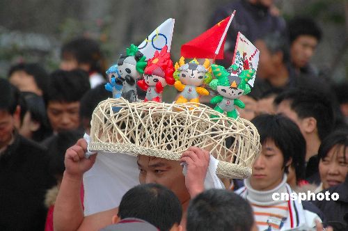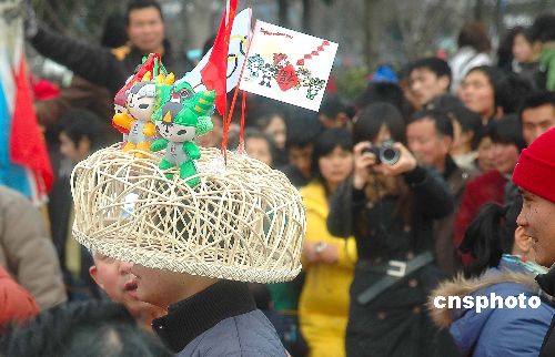 2月8日,一位頭頂“鳥巢”的市民出現(xiàn)在杭州公園,成為游人爭相追逐的“明星”。據(jù)悉,該帽是杭州市冬泳協(xié)會的杜仲明設計,請師傅用藤條做出的“鳥巢”,放上“五福娃”,特意為08新年冬泳“亮相”而裝扮。中新社發(fā) 引煒 攝