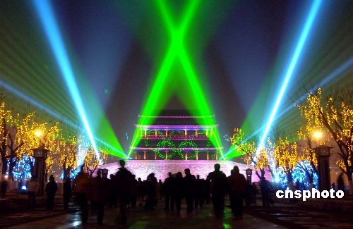 2月20日,北京永定門(mén)城樓開(kāi)始為元宵燈會(huì)試燈,電腦激光燈在城樓上印出奧運(yùn)五環(huán)、“同一個(gè)世界 同一個(gè)夢(mèng)想”、元宵節(jié)快樂(lè)等圖案和字樣。元宵節(jié)當(dāng)晚永定門(mén)城樓將上演一場(chǎng)絢麗的激光秀。中新社發(fā) 廖攀 攝