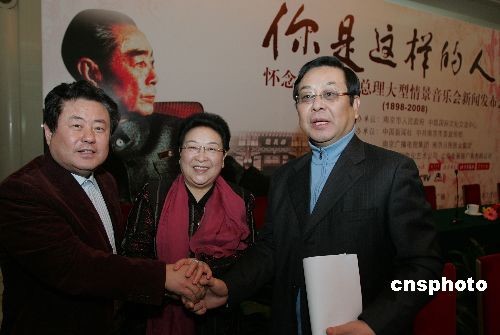 2008年3月5日是中國已故總理周恩來110周年誕辰,北京將舉辦系列紀(jì)念活動。2月25日下午,將于3月28日在北京人民大會堂舉行的大型情景音樂會《你是這樣的人》舉行新聞發(fā)布會,晚會總導(dǎo)演鄧在軍(中 周恩來侄媳)、藝術(shù)總監(jiān)、中華民族文化促進會副主席曾慶淮(右)、節(jié)目總監(jiān)、中國音樂家協(xié)會黨組書記徐沛東等出席。中新社發(fā) 任晨鳴 攝