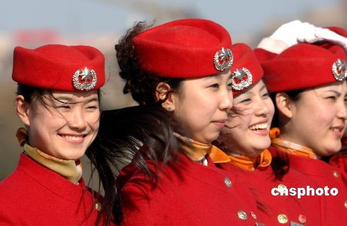 三月三日,北京天安門廣場,女服務(wù)員笑容燦爛迎“兩會(huì)”。當(dāng)日下午,全國政協(xié)十一屆一次會(huì)議在北京人民大會(huì)堂隆重開幕。中新社發(fā) 王東明 攝