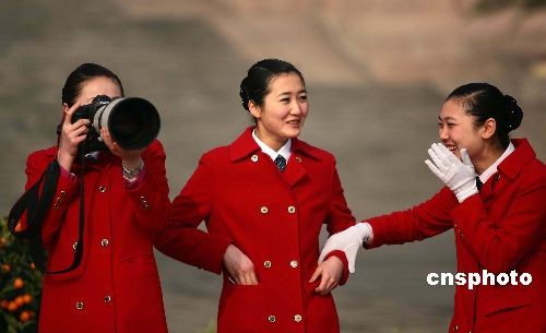 三月十日上午,十一屆全國(guó)人大一次會(huì)議在北京人民大會(huì)堂舉行第三次全體會(huì)議,三名兩會(huì)女服務(wù)人員在會(huì)場(chǎng)外好奇試用攝影記者的重“武器”。中新社發(fā) 盛佳鵬 攝
