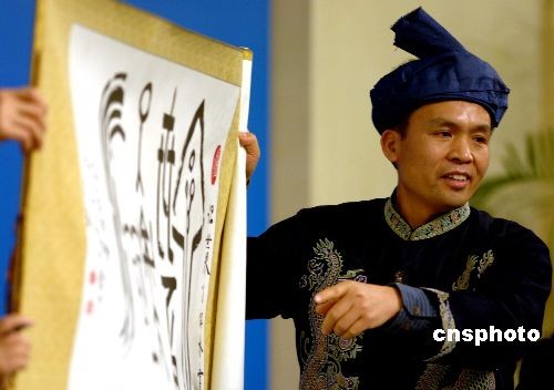 三月十日,貴州水族人大代表張加春在記者會上介紹“水文字”,并呼吁要大力保持“水文化”的獨特性。當日,八位少數(shù)民族代表在北京兩會新聞中心接受媒體采訪。中新社發(fā) 王東明 攝
