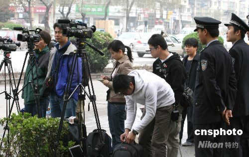 4月11日,天津市第二中級人民法院開庭對原中共上海市委書記陳良宇做一審判決。清晨開始,就有包括香港媒體在內(nèi)的多家媒體記者聚集在天津二中院附近進(jìn)行跟蹤報(bào)道。中新社發(fā) 齊天 攝