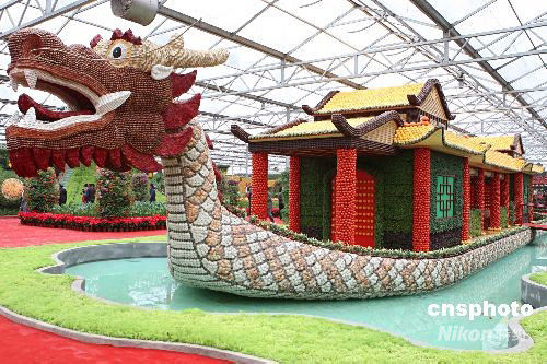 4月20日,一條名為“九船載福”的龍船在中國(壽光)國際蔬菜科技博覽會中展出,其高4.4米、長31米,共用花生果1.6萬顆,各種菜豆類種子2萬余粒,南瓜3.2噸,西紅柿鮮果4千公斤,朝天椒盆栽680盆,船體鑲嵌貝殼29萬片,各色菜苗1.6萬株,由29名工匠耗時4個月建成。本屆菜博會在山東壽光舉辦,主題是“現(xiàn)代·科技·希望”,展區(qū)面積達35萬平方米,擁有13個展廳,2000多品種,200多個蔬菜景點景觀。中新社發(fā) 趙雋 攝