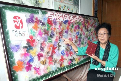 2008年4月23日,遼寧省二建筑工程公司退休職工76歲的老人白宏俊,忙碌5個月編制的長2米、寬80厘米的《百蝶迎奧運》掛圖,在版權局辦完了作品登記,拿到了“專利”證書。中新社發(fā) 劉寶成 攝