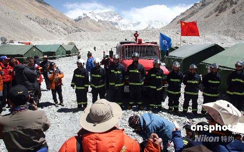 4月30日,受邀采訪2008北京奧運會火炬接力珠峰展示活動的中外媒體記者,集體探訪珠峰大本營,采訪駐扎在珠峰大本營的消防官兵。中新社發(fā) 盛佳鵬 攝