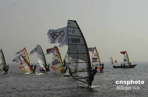 5月6日上午8時10分,北京奧運圣火在海南省?谑袀鬟f,為海南省奪得首枚全運會金牌的女子帆板運動員王麗芳傳遞第一棒火炬。圖為?谖骱0逗I戏尻爳鞚M奧運五環(huán)旗祝賀奧運圣火在?趥鬟f。中新社發(fā) 尹海明 攝