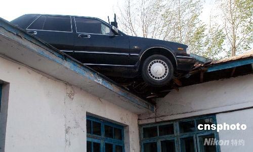 5月6日,在吉林延邊一處公路路面高于兩側(cè)房屋的特殊路段,一輛轎車被大風(fēng)吹到路邊低處房屋的屋頂上。當(dāng)日,吉林省延邊州遭大風(fēng)突襲,瞬時(shí)最大風(fēng)力達(dá)到十一級(jí),為延邊歷史上少有。中新社發(fā) 秦俑 攝