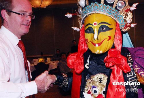 5月6日晚,在北京舉行的中外商貿(mào)合作項目洽談酒會上,來自四川的著名變臉?biāo)嚾藶榧钨e現(xiàn)場進行精彩的“變臉”,表演受到在座外國賓客的熱烈歡迎。中新社發(fā) 錢興強 攝