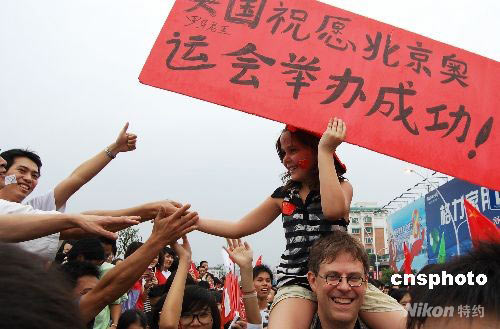 5月10日,圣火傳遞在汕頭舉行,一名外國小姑娘在現(xiàn)場舉出祝愿北京奧運會舉辦成功的標語牌,受到汕頭人民熱烈歡迎。中新社發(fā) 柯小軍 攝