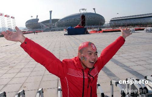 5月11日,奧運(yùn)圣火在福建泉州傳遞的前一天,一名僑鄉(xiāng)青年特地剃了個(gè)2008奧運(yùn)個(gè)性發(fā)型,來到火炬?zhèn)鬟f泉州終點(diǎn)站——海峽體育中心,提前感受奧運(yùn)激情。中新社發(fā) 傅丹丹 攝