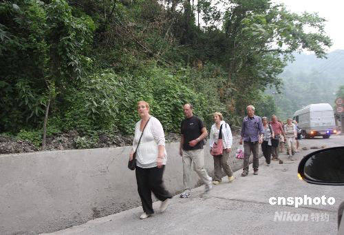 5月12日14時28分,在四川汶川縣(北緯31度,東經103.4度)發(fā)生7.8級地震。都江堰至汶川路段的水井灣大橋,發(fā)生約一百米寬的山體滑坡,已導致都江堰至汶川路段完全中斷,不少游客徒步數(shù)小時向都江堰方向前行,其中包括一些外國游客。中新社發(fā) 黃榮 攝