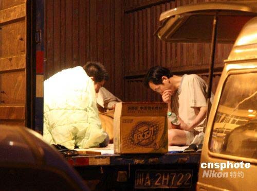 5月12日晚,成都的眾多市民均聚集在空曠地區(qū)或廣場(chǎng)過(guò)夜。據(jù)悉,截至13日零點(diǎn),四川災(zāi)區(qū)死亡人數(shù)已達(dá)近萬(wàn)人。圖為兩名當(dāng)?shù)厥忻裨谕T趶V場(chǎng)邊的貨車(chē)箱內(nèi)過(guò)夜。中新社發(fā) 郭晉嘉 攝