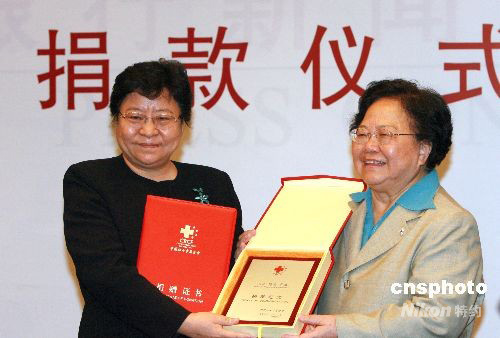 5月14日,中國銀行在北京舉行捐贈(zèng)儀式,向中國紅十字總會(huì)捐款1000萬元人民幣,用于汶川地震災(zāi)區(qū)援救工作。中國銀行副行長(zhǎng)張燕玲(左)接受捐款證書并在發(fā)布會(huì)上介紹:中國銀行各一級(jí)分行、直屬分行已為此次抗震救災(zāi)開啟緊急“綠色通道”,免除全部捐款的匯款手續(xù)費(fèi)。中新社發(fā) 廖文靜 攝