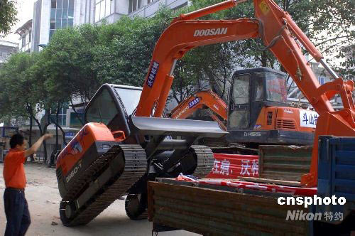 2008年5月15日,地震災區(qū)都江堰市危樓排險工作正在進行中。目前來自成都市企業(yè)的志愿抗震救災隊伍攜帶大型機械車輛開進都江堰市區(qū),與解放軍部隊一起展開危樓居民區(qū)的排險、救災、防疫工作。圖為成都市一企業(yè),派數量可觀的大小挖掘機和破損機進入江堰市危樓疏散區(qū)。汶川7.8級地震,給都江堰市帶來巨大破壞。目前危樓居民區(qū)疏散、安置工作已展開,取得一定成果。中新社發(fā) 鄒憲 攝