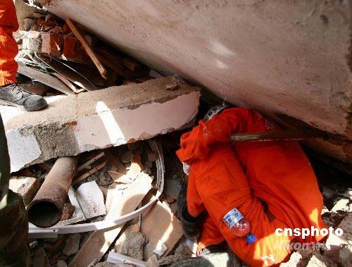 十五日十四時(shí),福州消防支隊(duì)赴川抗震救災(zāi)官兵在青川縣賓和路一家主建筑已全部坍塌的大型汽車(chē)維修廠(chǎng),用生命探測(cè)儀成功解救出一名被困女工。當(dāng)時(shí),在接群眾求助后,救援隊(duì)立即趕赴現(xiàn)場(chǎng),搜索分隊(duì)首先用生命探測(cè)儀確定了女工被困的大概方位,救援分隊(duì)迅速啟動(dòng)救生氣墊,并用鐵鍬和雙手以土工的方式為被困女工打開(kāi)了一條生命通道,半個(gè)小時(shí)后,被困女工被成功救出。中新社發(fā) 朱曉航 攝