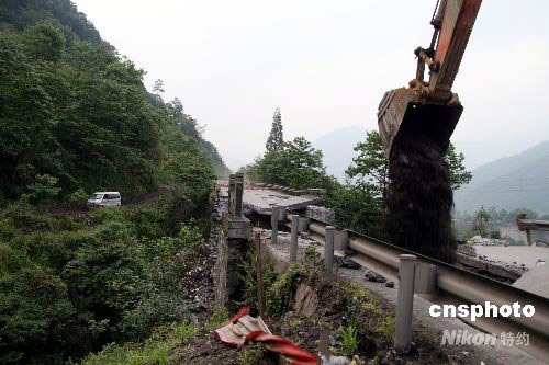 5月15日,四川交通部門緊張施工,修復(fù)什邡市紅白鎮(zhèn)境內(nèi)一座在震災(zāi)中損毀的橋梁。12日發(fā)生的汶川大地震波及四川省德陽(yáng)市下轄的什邡市(縣級(jí)市)的多個(gè)鄉(xiāng)鎮(zhèn),紅白鎮(zhèn)與外界交通、通訊被完全阻斷。15日下午16時(shí)許,外界到紅白鎮(zhèn)鎮(zhèn)街的道路被打通。中新社發(fā) 郭晉嘉 攝