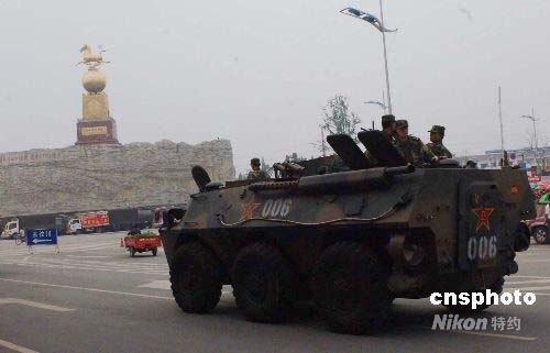 5月16日,新一批參加抗震救災(zāi)的解放軍乘裝甲運兵車開進都江堰市。中新社發(fā) 鄒憲 攝