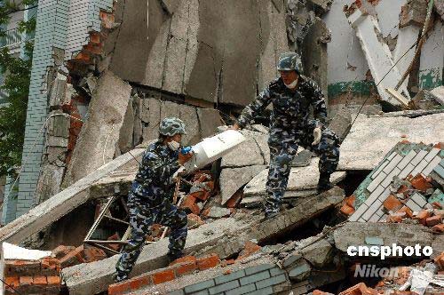 5月16日, 2750名海軍陸戰(zhàn)隊(duì)官兵分三個梯隊(duì)相繼順利到達(dá)四川地震災(zāi)區(qū),立即展開救援行動。第一梯隊(duì)到達(dá)綿竹縣漢旺鎮(zhèn)的760名官兵在災(zāi)情最嚴(yán)重的地方進(jìn)行搶險(xiǎn)救援,并在救援中使用了生命探測儀。目前,世界上只有美國和英國有這樣的生命探測儀,地震災(zāi)區(qū)中海軍官兵使用的是中國自行研制的,僅在漢旺鎮(zhèn),他們就有5臺這樣的儀器。圖為海軍陸戰(zhàn)隊(duì)官兵在四川綿竹縣漢旺鎮(zhèn)使用生命探測儀進(jìn)行搜救。中新社發(fā) 李唐 攝