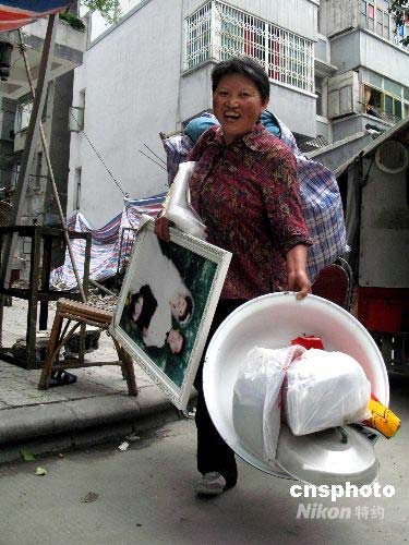 四川都江堰市蒲陽大道兩側(cè)居民建筑在大地震中造成致命性的破壞,已經(jīng)不能住人,不久將要徹底拆除。圖為一名婦女在余震較輕時(shí),冒險(xiǎn)回家取出生活用品,告別家園。中新社發(fā) 鄒憲 攝