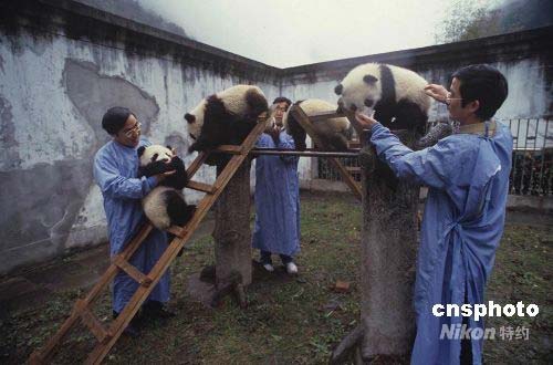 四川省汶川縣發(fā)生里氏7.8級(jí)強(qiáng)烈地震后,位于震中的臥龍大熊貓保護(hù)區(qū)通訊和交通全部中斷,與外界失去聯(lián)系。16日,兩名保護(hù)區(qū)工作人員攜帶衛(wèi)星電話(huà)坐直升飛機(jī)降落到臥龍以后,得到最新消息:繁育基地的大熊貓圈舍損毀嚴(yán)重,14座完全損毀,18座嚴(yán)重?fù)p毀,但因?yàn)橛袊鷫Γ^大部分大熊貓目前安全。幼仔已被轉(zhuǎn)移到平緩的安全地帶,但暫住條件相對(duì)擁擠。圖為地震之前,臥龍研究人員在精心照顧大熊貓幼仔。中新社發(fā) 羅小韻 攝