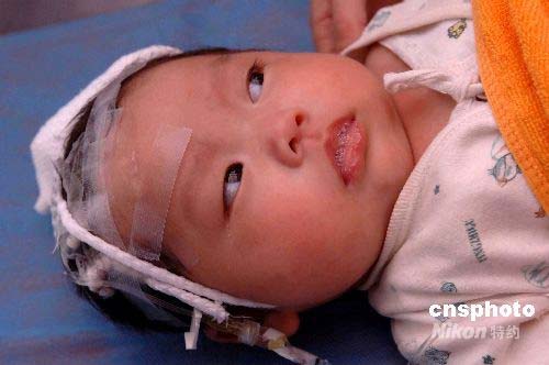 2008年5月17日下午,四川大學華西醫(yī)院抗震救災急診部門,接來一位出生剛80天,來自地震重災區(qū)四川綿竹的女嬰,她的名字叫廖靜萱。廖靜萱目前腦部出現(xiàn)腦水腫,可能將要進行腦部手術,其右腿也帶有地震創(chuàng)傷。中新社發(fā) 鄒憲 攝