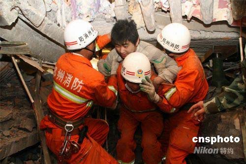 16日晚10時38分,在地震重災(zāi)區(qū)四川什邡市鎣華鎮(zhèn),鄭州消防支隊(duì)所在的河南總隊(duì)抗震救災(zāi)突擊隊(duì),經(jīng)過8個多小時的連續(xù)奮戰(zhàn),一名被困廢墟中的二十歲男子被成功救出,而此時,他在廢墟中已被困了104小時,他的名字叫李青松。中新社發(fā) 申治民 攝
