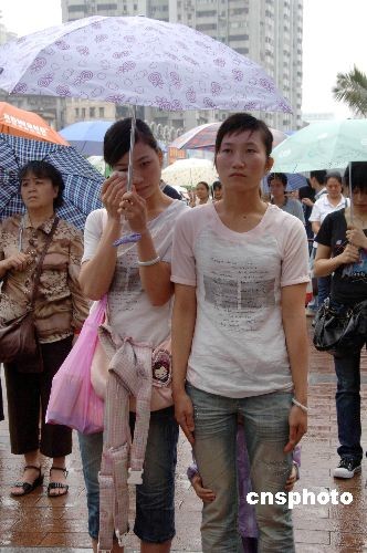 5月19日14時28分,在廣州上下九步行街上的市民在雨中默哀3分鐘,表達對四川汶川大地震遇難同胞的深切哀悼。中新社發(fā) 梁永強 攝
