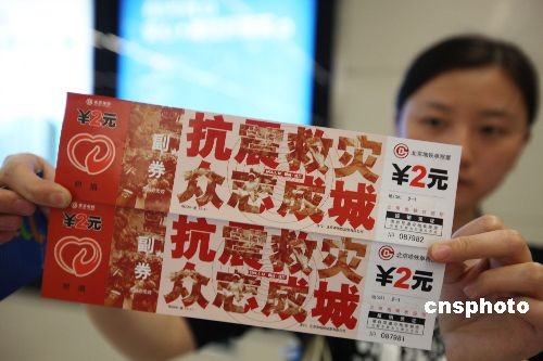 5月18日,北京地鐵首次發(fā)行的“特種”愛心附捐車票出現(xiàn)在北京地鐵所有車站售票臺,這套附帶為地震災區(qū)捐款獻愛心的文化車票受到了市民的青睞,北京地鐵公司將把附捐的40萬元愛心款全部轉交中國紅十字會。這套愛心附捐車票發(fā)行總量為10萬套,每張車票售價4元,其中包括2元捐給災區(qū)的款項。中新社發(fā) 老羅 攝