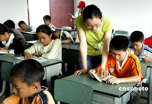 5月19日,來(lái)自地震重災(zāi)區(qū)的孩子在四川省成都市新都區(qū)“愛(ài)心學(xué)!钡恼n堂上接受老師輔導(dǎo)。全國(guó)首所專門(mén)為地震重災(zāi)區(qū)孩子開(kāi)辦的“愛(ài)心學(xué)!,18日上午在四川省成都市新都區(qū)新繁鎮(zhèn)正式開(kāi)課。首批就讀的166名孩子,分別來(lái)自彭州、都江堰、綿竹等重災(zāi)區(qū),有的孩子在震災(zāi)中失去了父母。新都區(qū)從各個(gè)學(xué)校抽調(diào)了近20名經(jīng)驗(yàn)豐富、有敬業(yè)精神和愛(ài)心的教師任課,并給學(xué)校安排了2名有資質(zhì)的優(yōu)秀心理健康輔導(dǎo)老師。