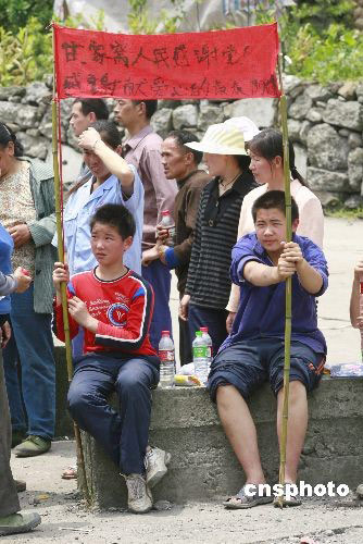 5月19日下午,四川省什邡市紅白鎮(zhèn)從深山里逃出來(lái)的兩名兒童在路旁手舉標(biāo)語(yǔ),感謝救助他們的好人。