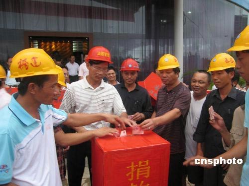 5月19日下午,海南文昌一家工地的渝、湘籍農(nóng)民工,自發(fā)組織為四川汶川地震受難者默哀3分鐘,隨后為災(zāi)區(qū)同胞捐款獻(xiàn)愛心。圖為農(nóng)民工慷慨解囊為災(zāi)區(qū)捐款。中新社發(fā) 付美斌 攝