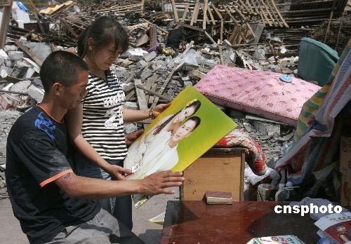 5月19日,四川省什邡市鎣華鎮(zhèn)仁和村三組梁正彬一家正在從廢墟中扒尋自家物品。他們很幸運,災(zāi)難發(fā)生時,包括老父母和年幼女兒在內(nèi)的全家5口人都跑出了轟然倒塌的房屋。“平安就是福!”他們默默收拾殘屋,準備重建家園。中新社發(fā) 張曉理 攝