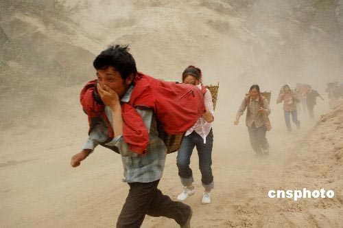 汶川重災(zāi)區(qū)仍然余震,崩塌、滑坡、泥石流等地質(zhì)災(zāi)害險(xiǎn)情不斷,被困受災(zāi)群眾由搶險(xiǎn)部隊(duì)協(xié)助安全撤離。圖為5月20日,汶川受災(zāi)群眾快速通過(guò)山體滑坡險(xiǎn)段。中新社發(fā) 陳文 攝