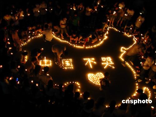 5月20日,全國(guó)悼念日第二天,“悼念四川汶川大地震遇難同胞”淮陰師范學(xué)院文通學(xué)院同學(xué)自發(fā)在學(xué)校操場(chǎng)為遇難同胞祈福,“中國(guó)不哭”中國(guó)加油,成百上千支蠟燭點(diǎn)燃了同學(xué)們的祝福,希望災(zāi)區(qū)人民早日從災(zāi)難中恢復(fù),重建家園。