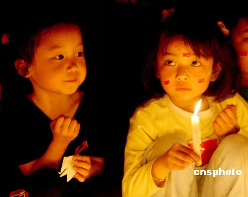 5月20日,安徽省淮北市網(wǎng)友的孩子在用燭光哀悼汶川大地震遇難者。當(dāng)晚8時(shí)許,安徽省淮北市許多論壇網(wǎng)友自發(fā)帶著孩子聚集在淮北兩宮廣場(chǎng),手持點(diǎn)燃的蠟燭,沉痛哀悼在地震中遇難的同胞,“加油中國(guó)、加油四川”的呼聲響徹現(xiàn)場(chǎng)。中新社發(fā) 王璋聞 攝