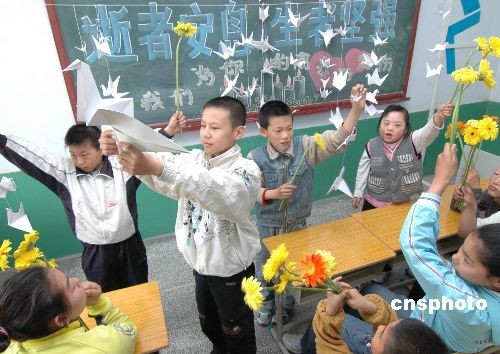 5月21日是全國哀悼日最后一天,遼寧省錦州市古塔區(qū)培智學校的300名智障小學生用雙手疊制了1000只紙鶴,還買來黃菊花悼念地震逝去的小朋友,放飛心愿,為災區(qū)人民祈福。中新社發(fā) 李鐵成jz 攝