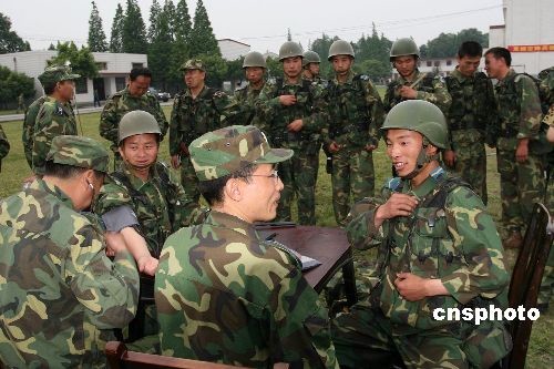 5月20日晚,輾轉奮戰(zhàn)在四川震中災區(qū)地帶的15名中國空降兵返回成都某軍用機場?战当巢300余名官兵在機場歡迎15勇士凱旋。完成第一輪抗震救災任務的15勇士原地待命,隨時準備執(zhí)行新的救災任務。這15名空降兵自5月14日12時25分傘降震中地帶茂縣后,就擔負起了震中地帶通信聯(lián)絡、災情勘察、情況上報等抗震救災任務。圖為空降兵接受身體檢查。中新社發(fā) 孫久奎 攝