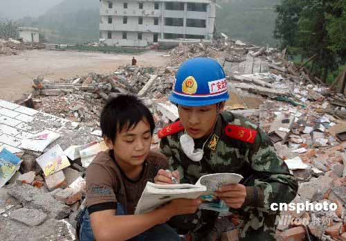 圖:四川武警廢墟上輔導(dǎo)災(zāi)區(qū)孩子功課