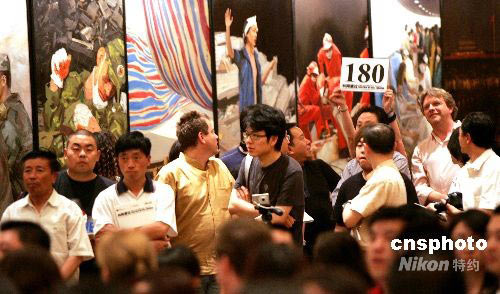 5月28日凌晨,“共同渡過·中國當(dāng)代藝術(shù)界賑災(zāi)義拍”在北京圓滿落幕,值得一提的是,由29名寫實(shí)畫派藝術(shù)家集體創(chuàng)作的以抗震救災(zāi)為主題的油畫作品參與了拍賣,并在43輪競價后拍出了3350萬元的天價。這場拍賣持續(xù)4個小時,全場總成交額一舉突破5100萬元人民幣,全部拍賣所得將通過中華慈善總會捐獻(xiàn)四川地震災(zāi)區(qū)。中新社發(fā) 楊可佳 攝