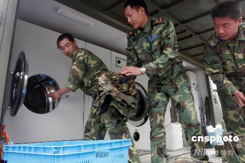 部隊流動洗衣車路邊為救援官兵和受災(zāi)群眾服務(wù)