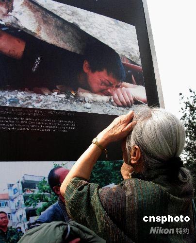 5月31日,北京王府井新華書店前,一名老人仔細(xì)觀看百名攝影家抗震救災(zāi)攝影展,一名四川省北川羌族自治縣的男子被壓在廢墟下等待救援的圖片,深深震撼了老人。此圖片是新京報(bào)記者郭鐵流5月15日在四川北川拍攝的。中新社發(fā) 鄒憲 攝
