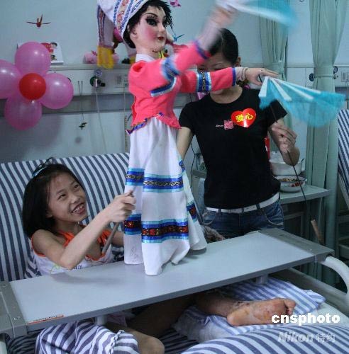 六月一日,一名來自四川地震災(zāi)區(qū)的小傷員快樂地和志愿者表演木偶劇《劉三姐》,齊唱廣西山歌。當(dāng)天,在廣西人民醫(yī)院接受治療的十五名四川小傷員歡樂度過“六一”兒童節(jié),醫(yī)院人員、志愿者、市民紛紛給小傷員送來禮物共慶節(jié)日。中新社發(fā) 林艷華 攝