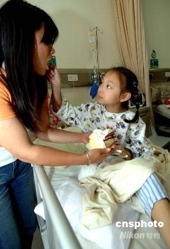 六月一日,福建省立醫(yī)院愛心病房,經(jīng)過兩次截肢的四川地震災(zāi)區(qū)受傷小女孩楊芹正在給媽媽喂蛋糕。在“5.12”汶川大地震中,楊芹的右腿被水泥板壓了近20個(gè)小時(shí),右大腿以下部分嚴(yán)重骨折、感染,神經(jīng)、肌肉等組織大量壞死,在一周之內(nèi)做了兩次截肢手術(shù),失去整條右腿。她后來被轉(zhuǎn)到福建省立醫(yī)院愛心病房接受治療。中新社發(fā) 王東明 攝