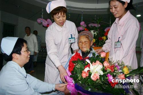6月1日,四川北川縣災區(qū)曲山鎮(zhèn)井夾山村99歲的杜銀珍老人在重慶市第二人民醫(yī)院十四病區(qū)醫(yī)務人員的精心打扮下,滿面笑容接受人們的百歲生日祝福。據(jù)了解,在5.12汶川大地震時,杜銀珍老人背著重孫在廚房做飯,廚房垮塌后,強大的沖擊波將她一下推出5米多遠,摔到在院壩里。后在孫媳婦的攙扶下趕了10里山路才碰到救援部隊,被送到綿陽市中醫(yī)院。5月19日轉至重慶市第二人民醫(yī)院接受治療。中新社發(fā) 陳仕川 攝