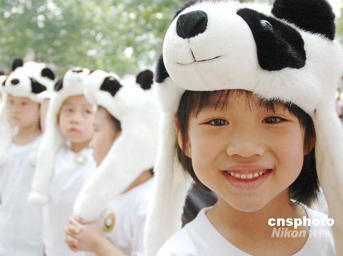6月5日上午,8只四川臥龍大熊貓首次與游客在北京動(dòng)物園見(jiàn)面。圖為參加首日見(jiàn)面活動(dòng)的北京小朋友頭戴可愛(ài)熊貓頭套。中新社發(fā) 魏瑋 攝