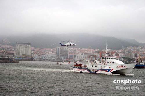 6月23日下午,山東省威海市在威海灣舉行大規(guī)模?樟Ⅲw搜救與船舶污染應(yīng)急演習(xí),檢驗(yàn)威海海域奧運(yùn)期間海上安全監(jiān)管與救助的能力。來(lái)自交通運(yùn)輸部北海救助局、交通運(yùn)輸部北海第一救助飛行隊(duì)、山東海事局海上巡查執(zhí)法支隊(duì)、陸軍和海軍駐威某部的11艘各類(lèi)船舶、1架救助直升機(jī)參加了演習(xí)。此次演習(xí)重點(diǎn)演練了海上交通管制、海上交通事故人命救助、船舶消防和船舶溢油圍控等。中新社發(fā) 李志強(qiáng) 攝