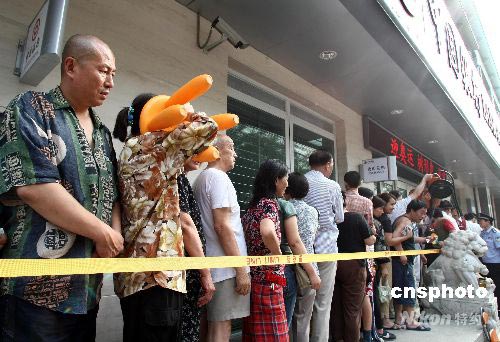 7月9日,北京,眾多市民在銀行門前排隊等候兌換奧運紀念鈔。由央行發(fā)行的600萬張10元面額奧運紀念鈔,9日與北京市民見面。北京市工商銀行、農(nóng)業(yè)銀行、中國銀行、建設(shè)銀行、交通銀行5家商業(yè)銀行約300個營業(yè)網(wǎng)點面向社會兌換紀念鈔,規(guī)定每人僅限兌換一張。許多市民甚至連夜排隊等候。中新社發(fā) 盛佳鵬 攝